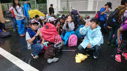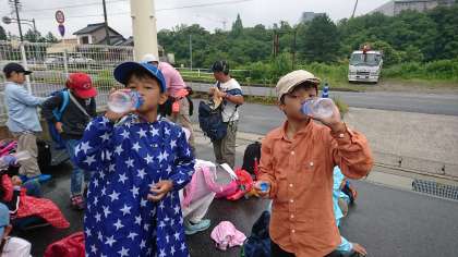 コンビニで一休み、ドリンクがうまい。「もう少しで学校だ。」と励まし合っていました。