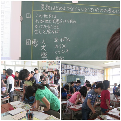 絵を見て貴族の生活について気づきを発表します。順番に発表し、同じ発表が出たらすわります。細かく見るといろいろな気づきがあります。