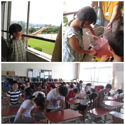 教室で育てたアゲハチョウが羽化しました。最後のアゲハです。ジャンケンで激戦を勝ち抜いた子が外へ逃がしてやります。