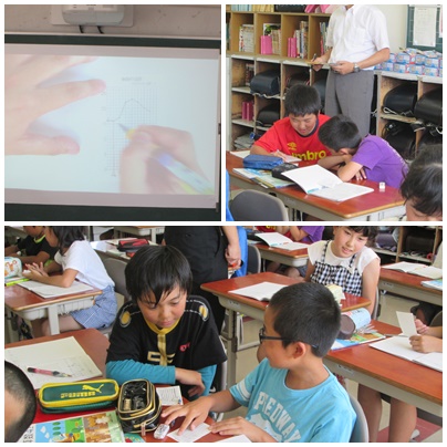 1日の地面の温度を題材にして折れ線グラフを学習します。「急に温度が上がったのはいつでしょう」グラフのどこに注目したらいいのか考え、話し合います。