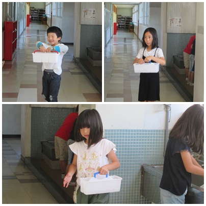 絵具を使います。水を廊下にこぼさないように慎重に運ぼうとする姿がわかるでしょうか。やさしい心遣いですね。