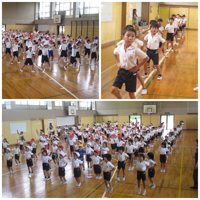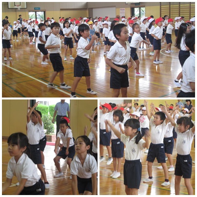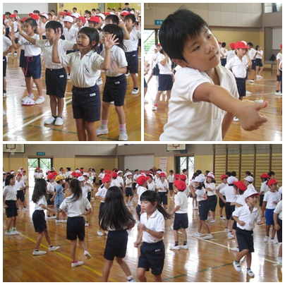 最後まで曲と合わせることができ「やってみよう」が一応完成しました。今度は運動場での位置合わせ、指先、目線など細かいところを練習し、本当の完成になります。