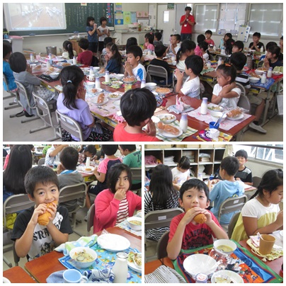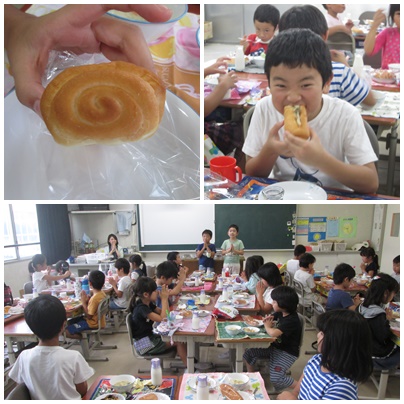 今日の給食はあいちの米粉パンが出ました。みなさんは、米粉パンにへそがあることを知っていますか。パンの生地を作るときに団子ではなくロールして作るからへそができるんです。知らなかったー。