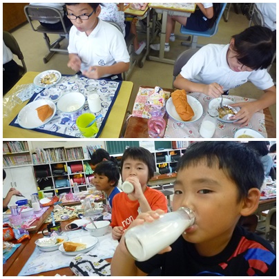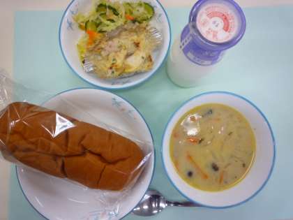 今日の給食は、あいちの米粉パン、豆乳スープ、鮭のコーンマヨネーズ焼き、ミニフレンチサラダ、牛乳でした。鮭のコーンマヨネーズ焼きは学校のオーブンで焼きました。鮭は岩手県で水揚げされたものです。クリームコーンとよくからんで、おいしかったです。