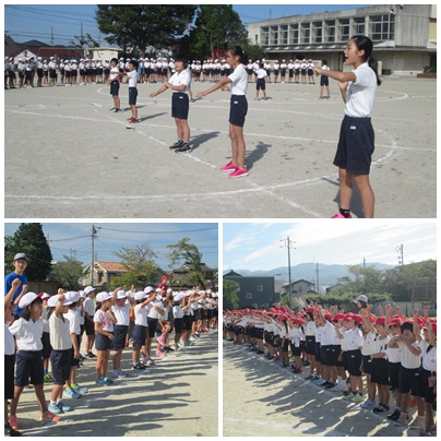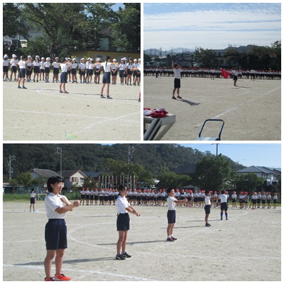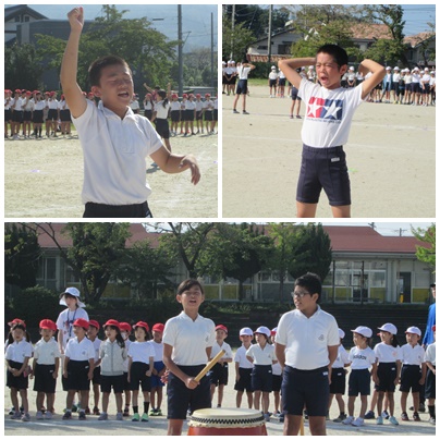 今朝の運動会の全体練習は、応援合戦です。応援旗や和太鼓を準備して本格的な練習です。自然に気合も入ってきます。今までの応援団だけの練習で、応援団の声はかなりかれてきています。