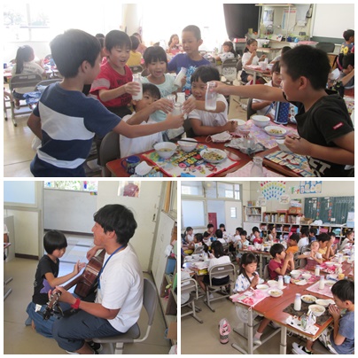 今日は○○君の誕生日です。「ハッピーバースディ」をクラス全員で歌い、牛乳で「カンパーイ」しました。ほほえましいひとときです。