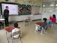 乾電池と豆電球を導線でどのようにつなぐと明かりがつくか調べます。+極と−極があることに気づきます。