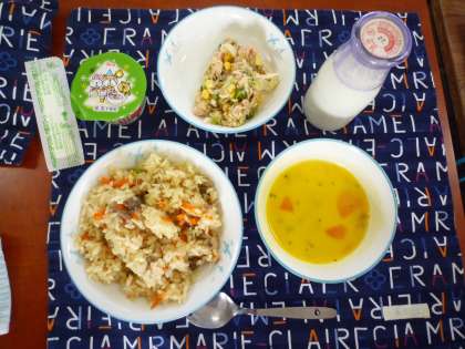 今日の給食は、ピラフ、かぼちゃのポタージュスープ、ツナサラダ、お楽しみデザート、牛乳でした。