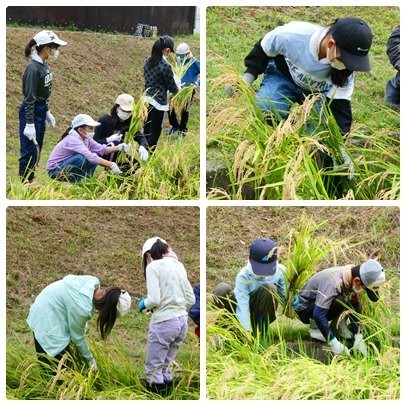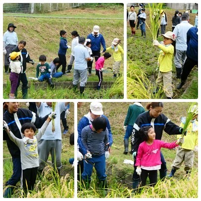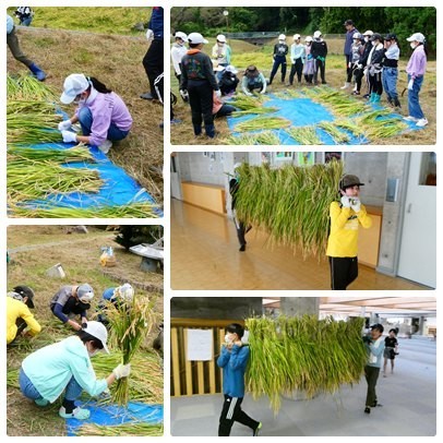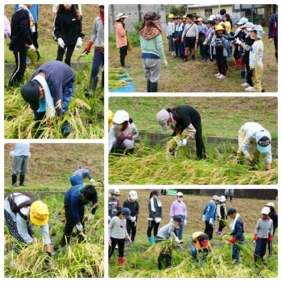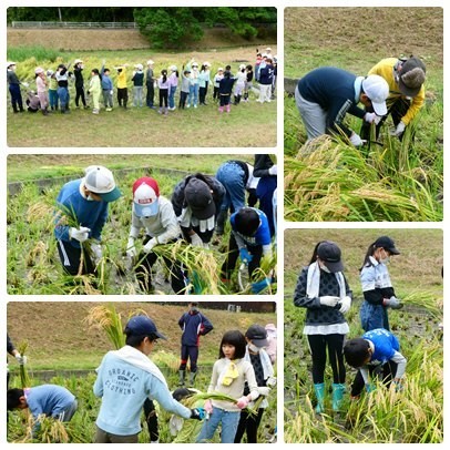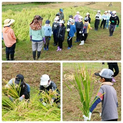 今日は3~5年生とあおば組の子どもたちが稲刈りをしました。田起こしや田植えの時と同じように、まずは5年生が稲の刈り方や注意点を地域の方に教えていただいて稲刈りを行っていきました。あおば組の子どもたちも参戦しました。そのあとは、4年生の子どもたちがやってきて、5年生がやり方を教えていきます。4年生は去年も刈っているのでどんどんと稲を刈っていきます。4年生のあとは3年生。3年生は初めての稲刈りなので、5年生がひとりずつついて一緒に稲刈りをしました。5年生の教え方はとても優しくて上手です。最後は5年生が残りの稲刈りをし、稲を束ねて竹に架けていきました。最後までしっかり活動してくれる5年生は本当に頼もしい存在になってくれています。次は脱穀です。