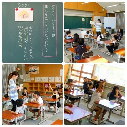 1年生の道徳は、学校生活でのさまざまな約束やきまりについて考えていました。皆が気持ちよく生活するためにはどうしたらよいのか、生活場面ごとに意見を出していました。1学期の頃に比べ、自分の考えがしっかりと伝えられるようになってきています。