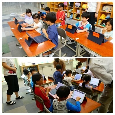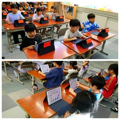1年生の外国語の授業では、いろいろな果物の名前を学習していました。「リンゴは?」「アップル!」「バナナは?」「バナーナ」とそれぞれの英語での呼び方を確認したあと、英語で発音された果物の札を取っていくのですが、今日はICT支援員さんがいらっしゃっていたので、タブレット上で英語カルタ取りにチャレンジしていました。