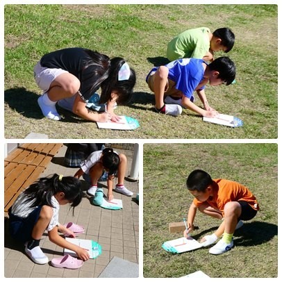 3年生は「太陽とかげ」の学習です。太陽の動きを観察するため、棒の影が時間とともにどのように変化していくのかを調べています。今日は絶好の「太陽とかげ」調べ日和でした。