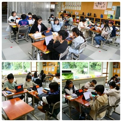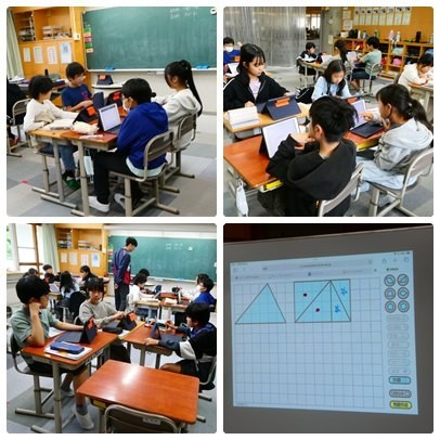 5年生算数は、三角形の面積の求め方の学習です。タブレットを使って考え方をまとめ、共有していました。答えの出し方は1つではありませんね。