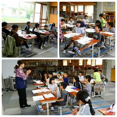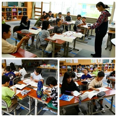 3年生の国語は前回学習した修飾語を使って文章を広げていく活動です。「どこで」「なにを」「どのような」「どのように」など、様々な種類の修飾語を用いて、素敵な文を作っていました。
