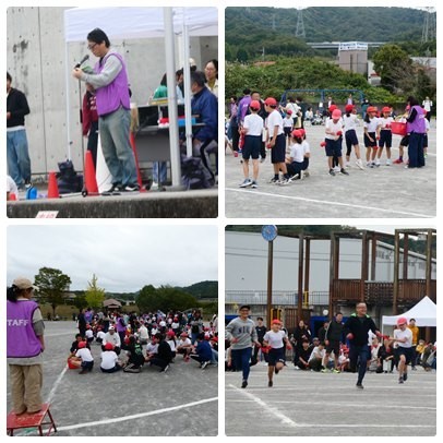 PTA種目「親子でいっしょ玉入れリレー」の様子です。PTA役員の方を中心に運営していただきました。子どもたちは、「お父さんと走る!」「お兄ちゃんと走る」などと、とてもうれしそうでした。玉入れは意外と難しくて、思ったようには入らず、悔しそう(なお父さんたち)でしたが、それでもたすきを次につなぐために、必死に走って行きます。