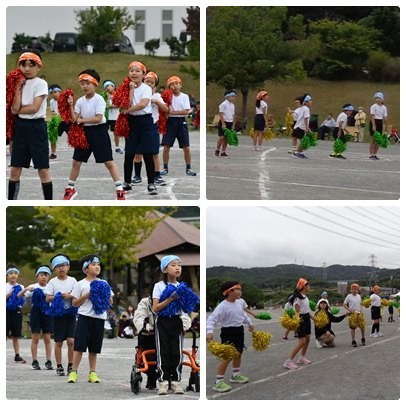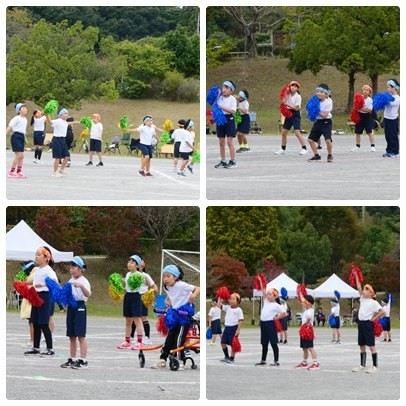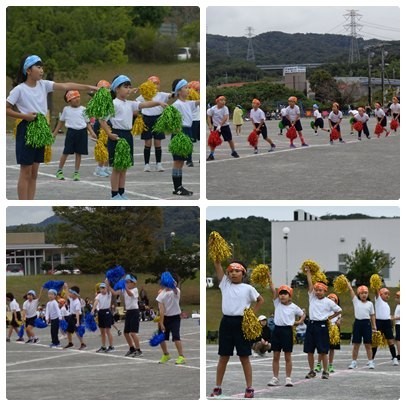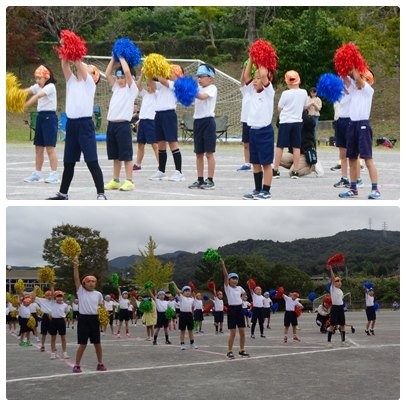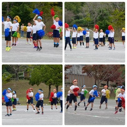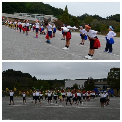 大玉転がしのあとは、1,2,3年生による集団演技「えがお100%」です。3年生はずいぶん早くから練習に入り、1,2年生を引っ張ってきました。1,2年生も一生懸命練習し、振り付けやフォーメーションを覚えました。当日はちょっと緊張しながらも、笑顔で踊りました。見ているこちらも思わず笑顔になります。