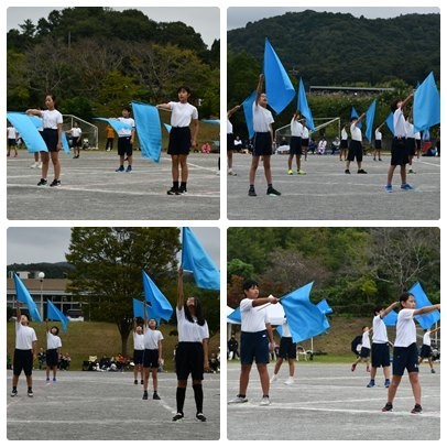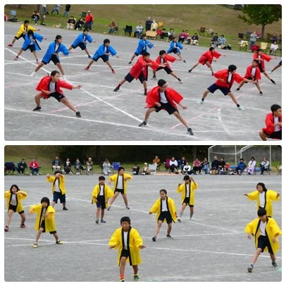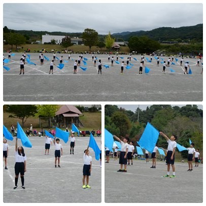 4,5,6年生の集団演技は「ソーラン魂 Sorandamasi」です。学年ごとのはっぴを着て、りりしく踊ります。動きが機敏で躍動感のある演技に見る側も魅了されていました。そのあとはフラッグを使っての演技。旗を振る音が一体となって運動場に響き渡りました。