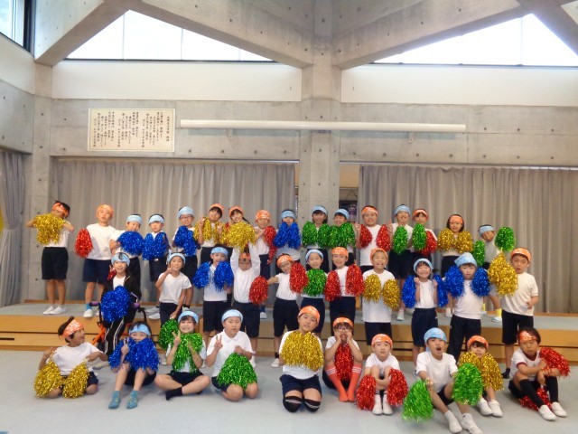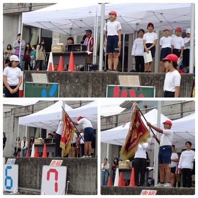 閉会式。大逆転の末、赤組が勝利です。優勝旗を渡され、代表児童が喜びを表現しました。そのあとぽつりぽつりと雨が・・。みんなが競技し終えるのを空も待ってくれていたかのようでした。「エンジン全開 みんなヒーロー」のスローガンのとおり、みんなが協力しながら全力で取り組み、一人ひとりがヒーローとして、しっかりと輝いていました。素敵な運動会でした。