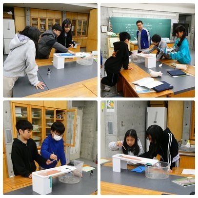 理科の「流れる水のはたらき」の実験です。川の水が上流から下流へと流れていくと川や周囲の土地の様子はどのように変化するのか、水のはたらきについて実験器具を使って調べていました。