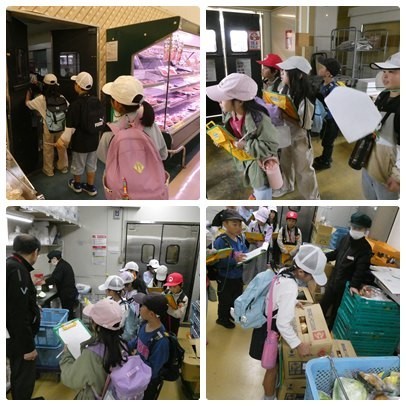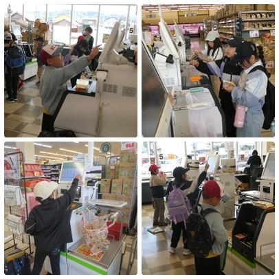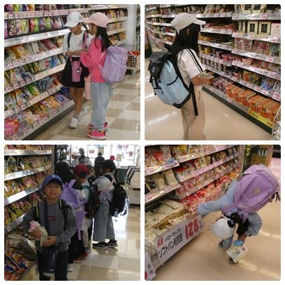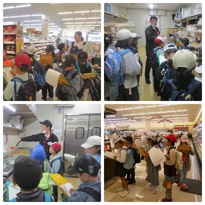 社会科の「店で働く人々」の学習で、地域のスーパーマーケット「バロー」に見学に行きました。店内だけでなく、普段はなかなか見ることのできないバックヤードを見せていただき、お店の工夫や働く人々の苦労について学びました。店長さん、副店長さんのお話を真剣に聞き、メモ用紙びっしりに書き込んでいました。最後は、実際にバローでお買い物。買う物が見つからなかったり、セルフレジを初めて使う人もいたりしましたが、無事に買い物を済ませて帰ってきました。