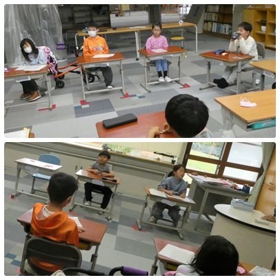 2年生はかけ算の九九の総まとめでしょうか。先生がばらばらに問題を出し、当てられた児童が答えていました。少し前に苦戦していた子どもたちもずいぶんしっかりと覚えてきました。