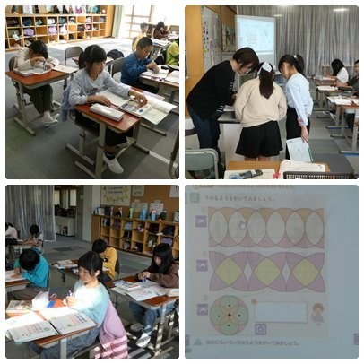3年生は「円と球」の学習です。コンパスの使い方も徐々に慣れてきました。今日は、教科書に書かれた模様をコンパスを使ってノートに書き写していました。それができたら、自分で好きな模様を考えて書いていました。