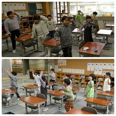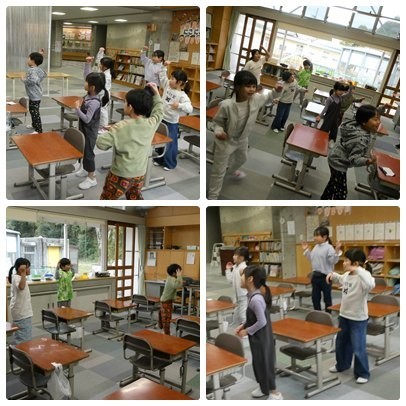 今日はALTの先生が来てくださっていて、外国語活動を行っていました。みんなが大好きな、ABCの体操?をしていました。体でアルファベットを表現しています。みんなのポーズは何のアルファベットかわかりますか?