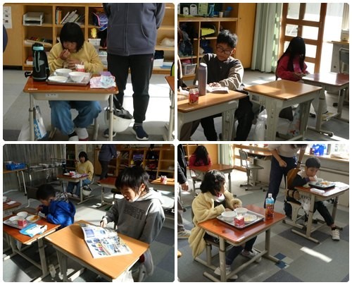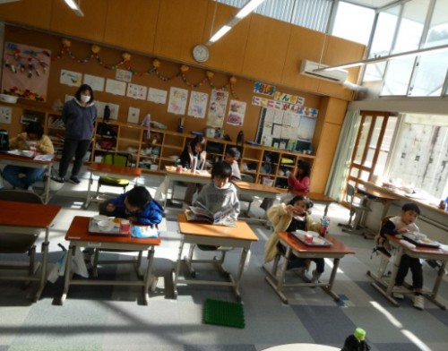 あおば組の朝の様子と給食時の様子です。早く食べ終わった子は本を読むなどして静かに過ごしています。みんなしっかりと食べていました。