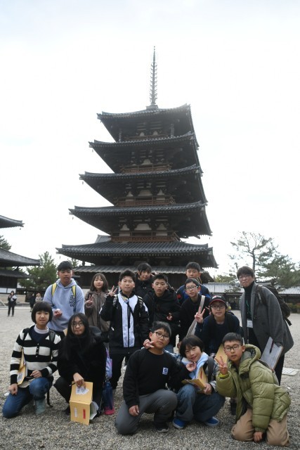 法隆寺に到着し、法隆寺の見学をしました。比較的すいています。ガイドさんの話をしっかりと聞いて、一生懸命メモをとっていました。