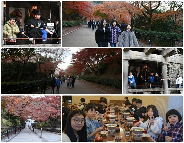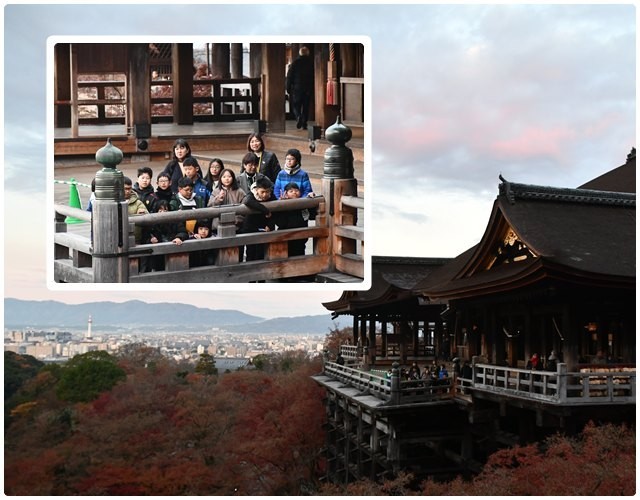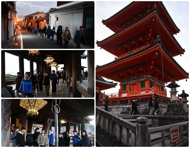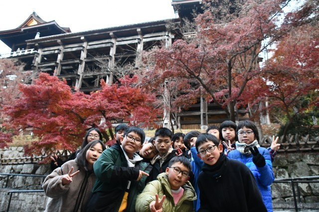 2日間の朝です。朝一番に清水寺へ向かいました。空気は冷たいですが、風がないので寒さもそこまで苦になりません。これが清水の舞台かと、偉大さを感じながら京都の景色を見下ろし、下へ降りると、下から見た迫力もまたすごかったです。すいていたので音羽の滝で水飲みも行うことができました。紅葉もきれいに残っていて、ぎりぎり秋の風情も感じることができました。宿に帰って、やはりおなかはぺこぺこ。温かいご飯をおいしくいただきました。