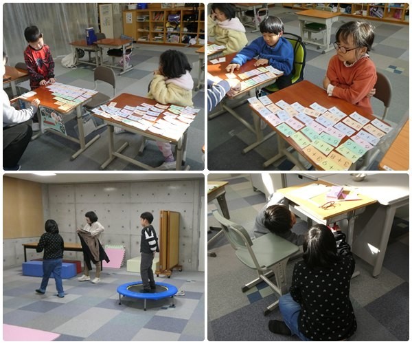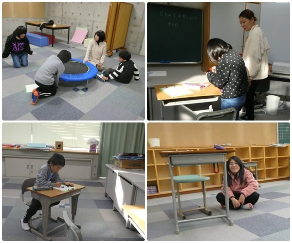 あおば組の様子です。1年生は算数の授業でした。足し算の表を作って秘密の法則を探っています。3年生は自立活動、トランポリンを使って運動しています。4、5年生は理科。磁石の性質について、どんな物が磁石に付くのか、教室内のいろいろな物に磁石を近づけて、付く物、付かない物に分けていました。