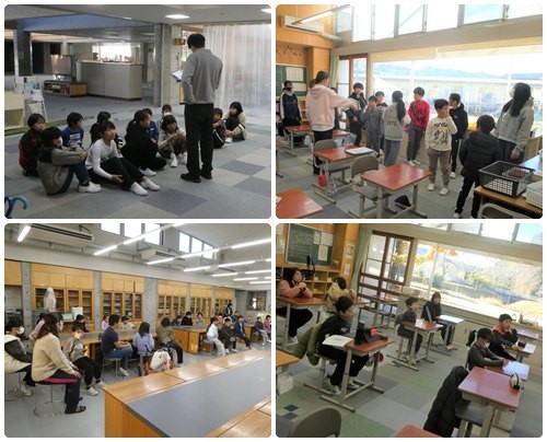 今日の業前は、通学団別児童会の時間です。それぞれの通学団に分かれて登下校の様子や時間などについて2学期の反省をしました。また、冬休み中の交通安全や生活についても確認しました。