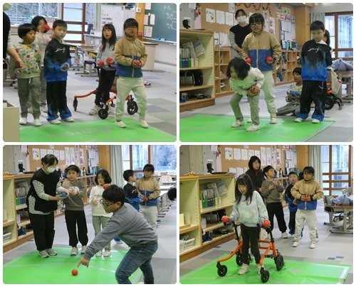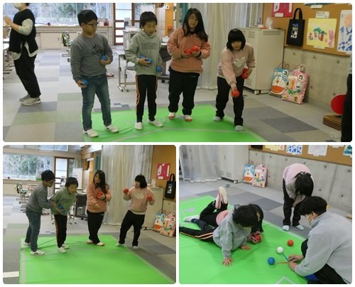 今年度、品野台小学校が福祉実践校の指定を受けており、ボッチャを学校に買っていただけました。今日はあおば組で実際にボッチャをやってみました。赤チーム青チームが交互に玉を投げて、最後に白いボールに近い方が勝ちとなります。白熱した戦いが繰り広げられていました。