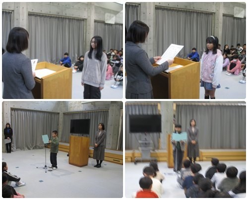 2学期の終業式が行われました。はじめに応募献立と日本語スピーチコンテストの表彰を行いました。その後の終業式では、校長より2学期の振り返りの話があり、2年生と5年生の代表児童が2学期に頑張ったことと3学期の目標を立派に発表しました(5年生の写真がぶれてしまっています。ごめんなさい)。その後、全員で校歌を歌い、生徒指導担当や清掃担当からのお話を聞きました。とてもしっかりと聞くことができていました。