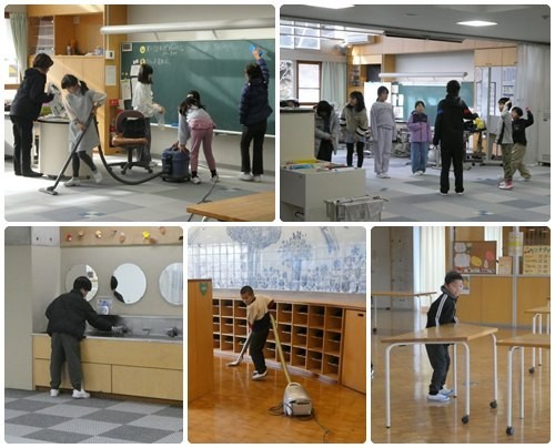 始業式が終わったあとは、縦割り班での清掃活動を行いました。寒い日でしたが、皆しっかりと自分の担当の清掃をしていました。2学期の大掃除でランチスペースの机や椅子をどかし、冬休みにワックスをかけたため、その机や椅子を元に戻さなければならなかったのですが、担当の子どもたちはもちろんのこと、清掃から戻ってきた子どもたちが椅子を運ぶのを快く手伝ってくれました。おかげでスムーズに元通りにすることができました。