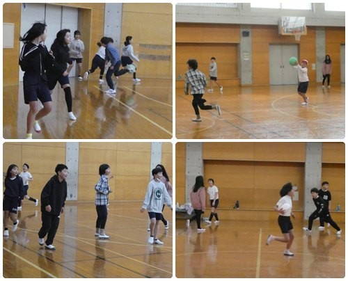 5,6年生の体育は、「ドッジボール???」と思いきや、なんだかちょっと様子が違います。ボールを持った子どもが真ん中の線を越えてどこまでも追いかけてきます。そして、逃げる子もどこまでも逃げていきます。聞いてみると、線はないのだそう。体育館全面を使ってドッジボールをしていました。ボールも3つあるので、なかなかの運動量です。