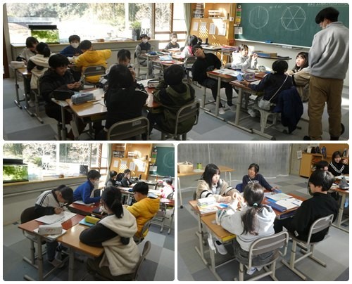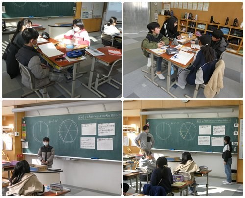 5年生は、正六角形をコンパスで作図し、なぜコンパスで正六角形がかけるのかを考えていました。正六角形の謎に迫っています。