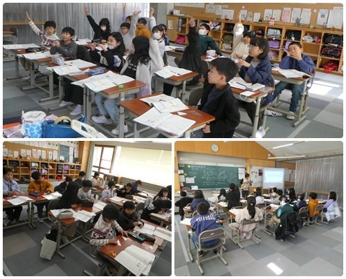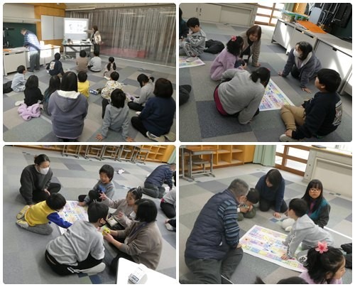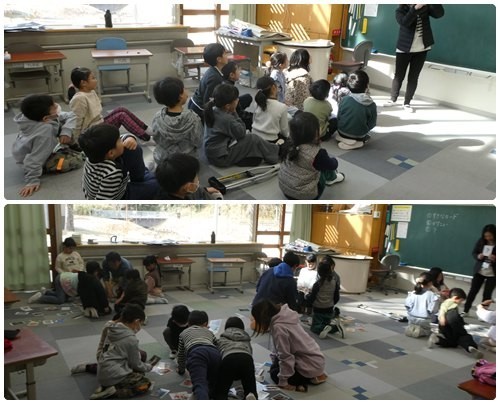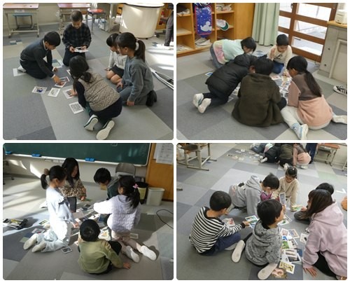 今日は掛川小学校との交流日です。1,2年生は図工のアートカードを使って自分がイメージする絵を選んでいました。イメージする絵がぴたりと合ったり、人それぞれ違ったり・・・。3年生は算数。自分たちで三角形を切り取り、角の大きさについて勉強していました。あおば組ではみんなですごろく遊びをしました。お題がいっぱいの楽しいすごろくでした。