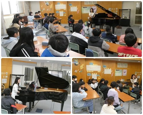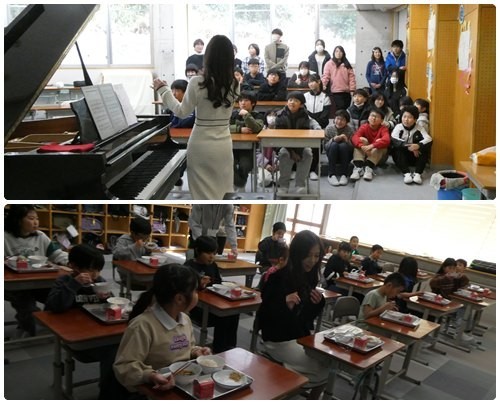 本日、学校アウトリーチプログラムという瀬戸市文化振興財団による事業が行われました。プロのピアニストである安藤千紗都様にお越しいただき、実際の演奏を通して生の芸術と触れる機会をもつことを目的とした事業です。4時間目は5、6年生を対象に音楽の授業をしていただきました。最初子どもたちは各机に座って聞いていましたが、途中からピアノを弾く様子が見られる側にぎゅっと寄って授業を行いました。ピアノを弾く手の動きの速さに見入ってしまいます。授業は品野台小学校の卒業生でもある安藤さんと、品野台の思い出話などを交えながら進められていきました。給食時は3年生の教室で子どもたちと一緒に給食を食べました。