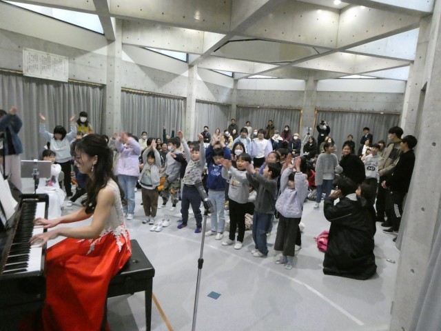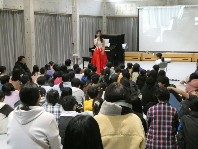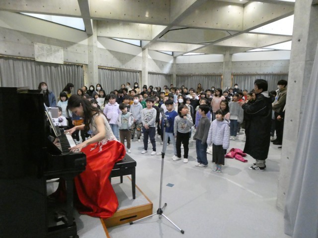 5時間目は全校児童が参加してのミニ演奏会です。ショパンやベートーベン、リストなど王道のクラッシック音楽から、「ライラック」や「千本桜」などのポップスまで幅広い音楽を聴かせていただきました。最後はプロピアニストの伴奏による贅沢な校歌の大合唱で締めくくりました。
