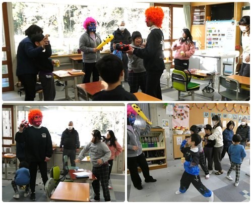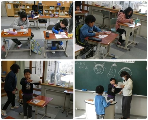 節分の日の今日、あおば組の子どもたちは、かわいらしい鬼の絵を描いていました。そこへ・・・。本当に(?)鬼がやってきました。子どもたちは新聞紙を丸めて作った豆を鬼に向かって投げていました。「鬼は外!」鬼は逃げていきましたとさ。