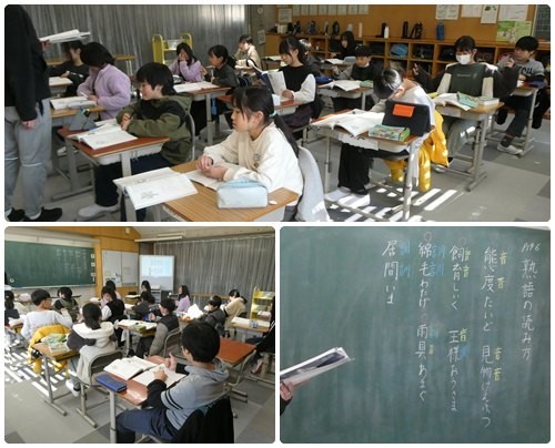 5年生は「熟語の読み方」の学習です。音読み訓読みは紛らわしい物も多いです。辞書を使って調べている子もいました。「重箱読み・湯桶読み」など、複雑な読み方もありますね。