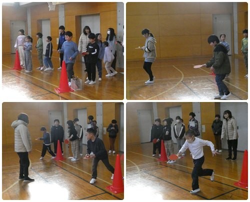 今日の業前から1時間目にかけて、児童会行事の「ゲーム祭り」が行われました。運営委員の子どもたちが案を考えました。縦割り班のチームでそれぞれの場所に移動し、チーム戦を行いました。2枚目は卓球リレーの様子。ラケットの上にピンポン球をのせてリレーします。やってみると意外と難しいです。3枚目は、ジェスチャー伝言ゲーム。お題にそってジェスチャーで伝えていくのですが、途中から全然違った方へ伝わっていく班も・・・。うまく伝わったでしょうか。