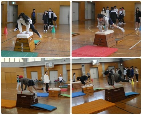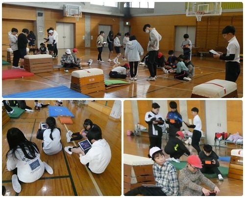 5、6年生の体育は跳び箱の授業でした。タブレットで手をつく位置や踏み切り方などを各自確認しています。練習ではみんな手の位置に気をつけて練習していました。跳べるようになると気持ちがいいですね。
