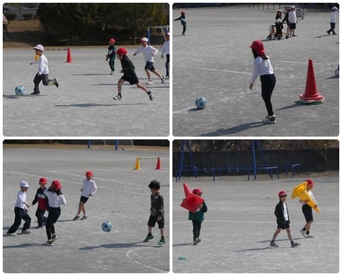 1、2年生で行っているボール蹴り。ドリブルやシュートの練習を経て、ミニゲームを行っていました。盛り上がっています。
