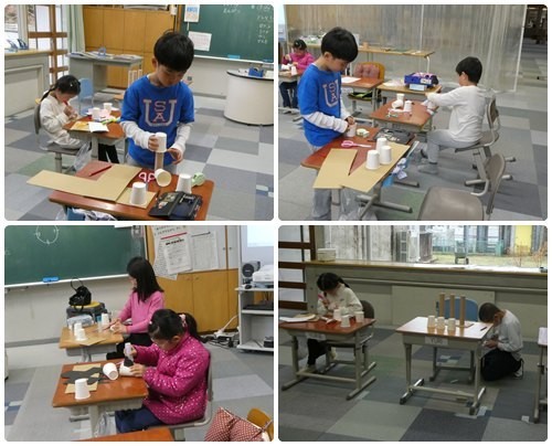 2年生の図工は、紙コップと輪ゴムを使って、飛び跳ねるおもちゃ作りをしていました。紙コップが飛び出す動きから、どんな絵や飾りをつけようかイメージを広げていました。完成が楽しみですね。