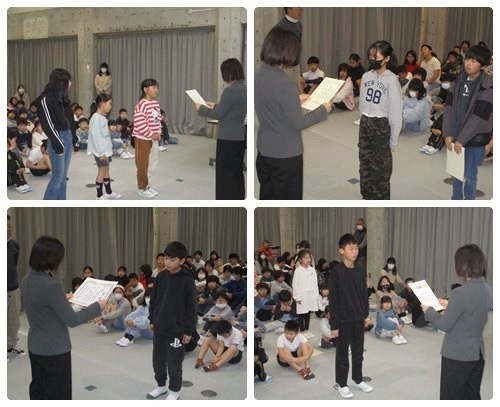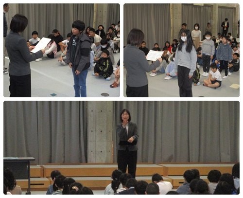今朝は朝会がありました。人権理解の作品(標語・書写)、読書感想画や版画コンクールの表彰など、数多くの表彰がありました。表彰のあとは、校長より冬季オリンピックの様子から、「感謝」についての話がありました。6年生の卒業まであとわずか。ともに感謝の気持ちをもって過ごしていきたいですね。