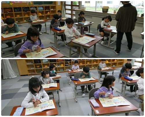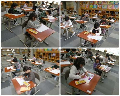 1年生2時間目は図工の時間でした。クレパスを使って、自分の好きなものの絵を描いていました。それぞれ好きなものがいろいろあって、どんどん描き上げていきました。3時間目は算数。教科書に書かれた絵を見て、「何がいる」とか「いくつある」などと話し合っていました。