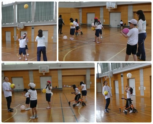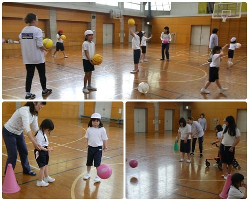 あおば組の体育の様子です。今日はボール運動です。ボールを投げたり転がしたり、高く上げたりして、ボールに慣れる遊びをしていました。最後にはみんなで転がしドッジボールをしました。
