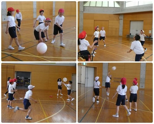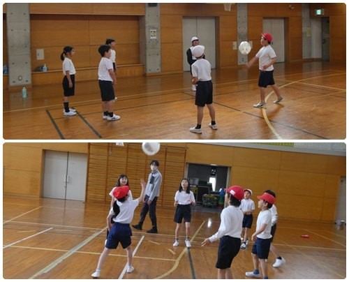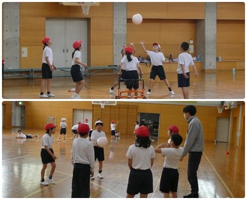 体育館から賑やかな声が聞こえてきます。3年生と4年生がソフトバレーボールを使って、パスの練習をしていました。上の方に向かって打ち上げるのが意外と難しく、苦労しています。